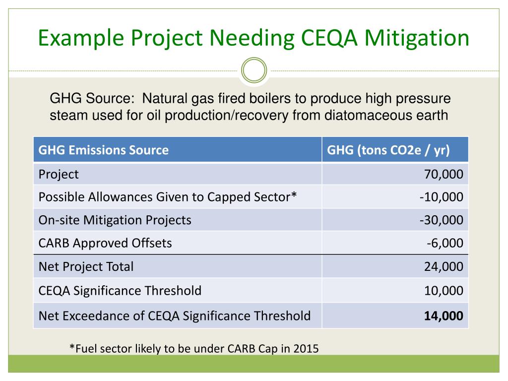 Example Project Needing CEQA Mitigation GHG Source: Natural gas fired boilers to produce high pressure steam used for oil production/recovery from diatomaceous earth *Fuel sector likely to be under CARB Cap in 2015