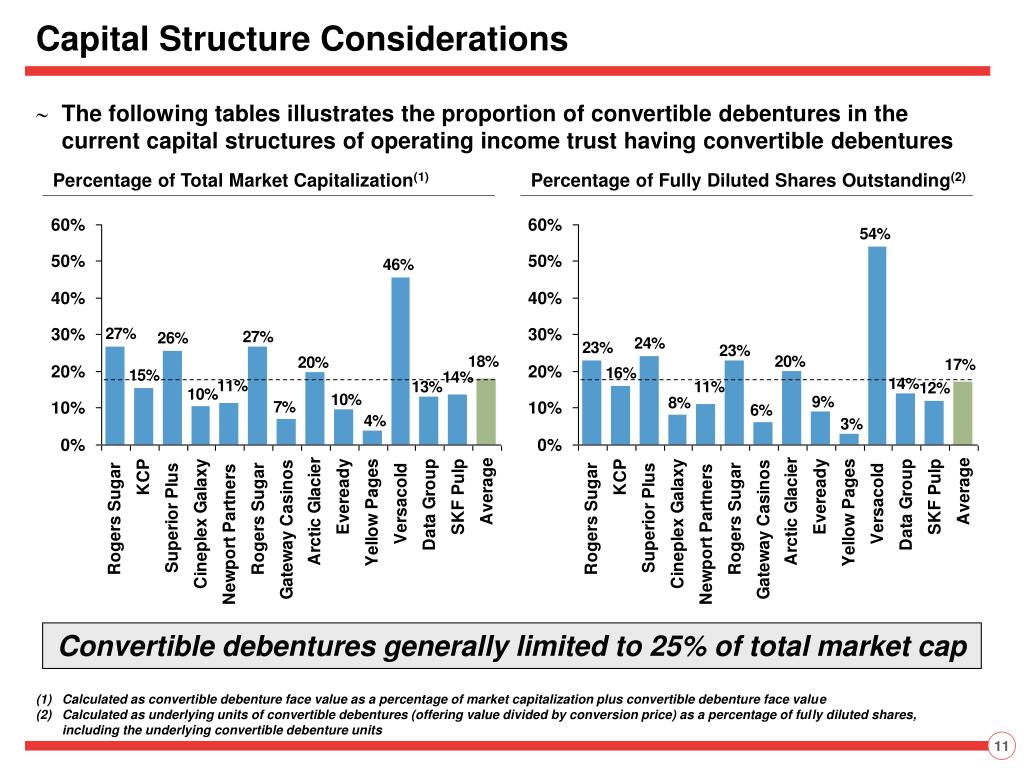 Capital Structure Considerations • The following tables illustrates the proportion of convertible debentures in the current capital structures of operating income trust having convertible debentures Percentage of Total Market Capitalization(1) Percentage of Fully Diluted Shares Outstanding(2) Convertible debentures generally limited to 25% of total market cap (1) Calculated as convertible debenture face value as a percentage of market capitalization plus convertible debenture face value (2) Calculated as underlying units of convertible debentures (offering value divided by conversion price) as a percentage of fully diluted shares, including the underlying convertible debenture units