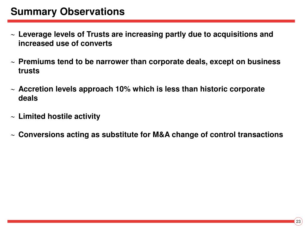 Summary Observations • Leverage levels of Trusts are increasing partly due to acquisitions and increased use of converts • Premiums tend to be narrower than corporate deals, except on business trusts • Accretion levels approach 10% which is less than historic corporate deals • Limited hostile activity • Conversions acting as substitute for M&A change of control transactions