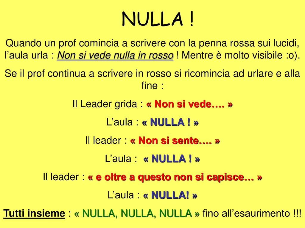 NULLA ! Quando un prof comincia a scrivere con la penna rossa sui lucidi, l’aula urla : Non si vede nulla in rosso ! Mentre è molto visibile :o). Se il prof continua a scrivere in rosso si ricomincia ad urlare e alla fine : Il Leader grida : « Non si vede…. » L’aula : « NULLA ! » Il leader : « Non si sente…. » L’aula : « NULLA ! » Il leader : « e oltre a questo non si capisce… » L’aula : « NULLA! » Tutti insieme : « NULLA, NULLA, NULLA » fino all’esaurimento !!!