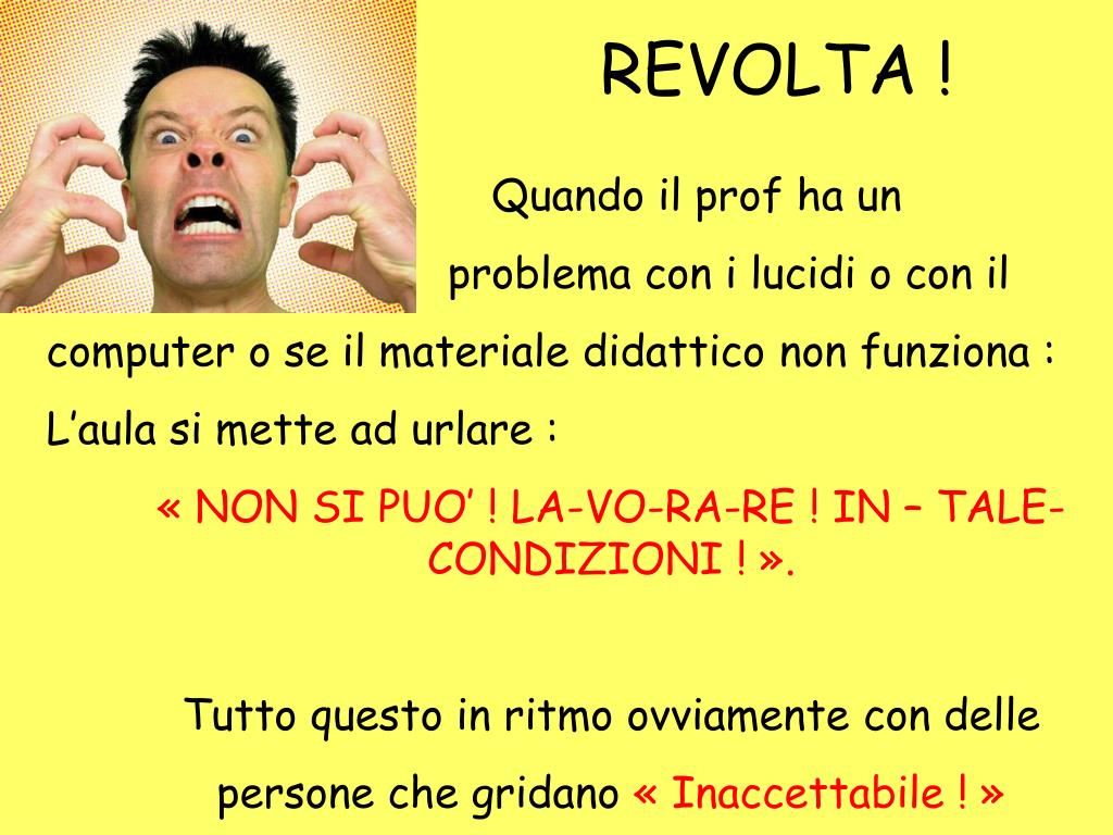 REVOLTA ! Quando il prof ha un problema con i lucidi o con il computer o se il materiale didattico non funziona : L’aula si mette ad urlare : « NON SI PUO’ ! LA-VO-RA-RE ! IN – TALE- CONDIZIONI ! ». Tutto questo in ritmo ovviamente con delle persone che gridano « Inaccettabile ! »