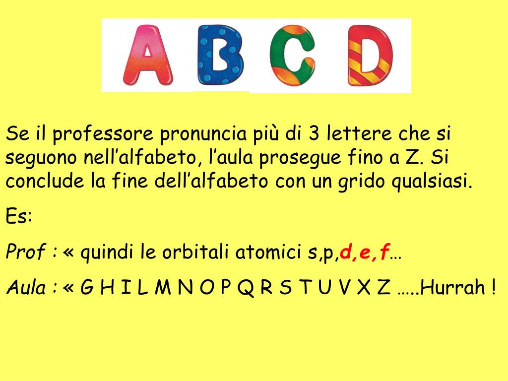 Se il professore pronuncia più di 3 lettere che si seguono nell’alfabeto, l’aula prosegue fino a Z. Si conclude la fine dell’alfabeto con un grido qualsiasi. Es: Prof : « quindi le orbitali atomici s,p,d,e,f… Aula : « G H I L M N O P Q R S T U V X Z …..Hurrah !