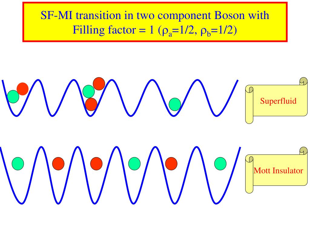 SF-MI transition for bosons in a periodic potential Bose-Hubbard Model : onsite interaction hopping Fisher et al, PRB(1989) U/t << 1 : Superfluid U/t >> 1 : Mott insulator Jaksch et al, PRL(1998) (for optical lattice) Integer density => SF-MI transition