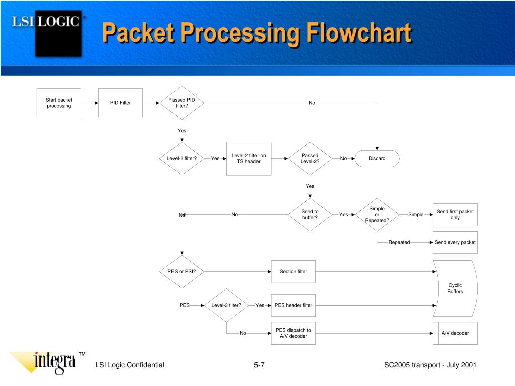 PES Header Filters (cont.) • Range filters (min and max) for: • PTS fields • DTS fields • If PES header filters match: • A/V PES data is sent to the A/V decoder • Non-A/V PES is posted to the cyclic buffer • DPR interrupt is generated after last PES byte is posted