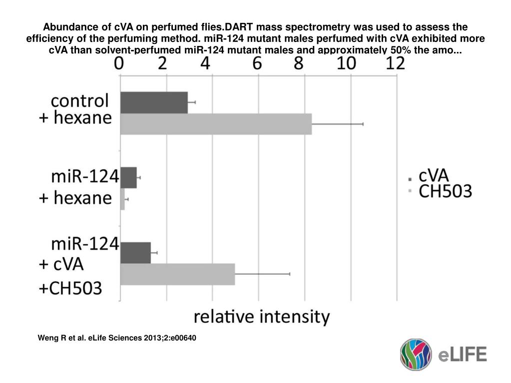 Abundance of cVA on perfumed flies.DART mass spectrometry was used to assess the efficiency of the perfuming method. miR-124 mutant males perfumed with cVA exhibited more cVA than solvent-perfumed miR-124 mutant males and approximately 50% the amo. Weng R et al. eLife Sciences 2013;2:e00640.