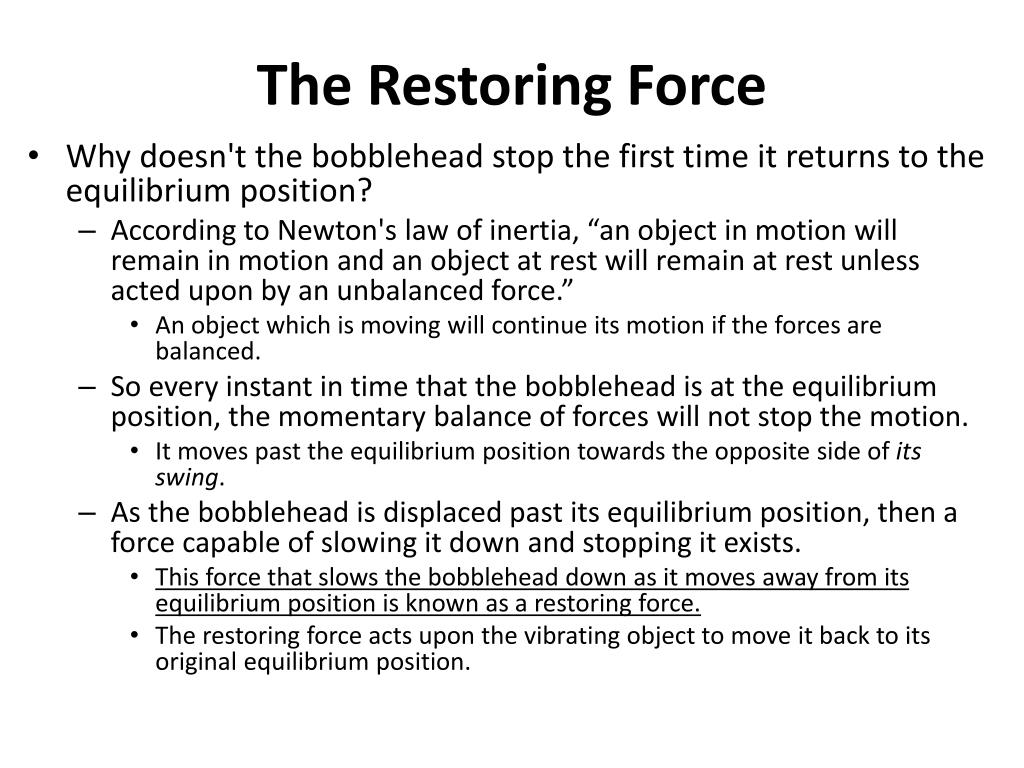 The Restoring Force • Why doesn't the bobblehead stop the first time it returns to the equilibrium position? • According to Newton's law of inertia, “an object in motion will remain in motion and an object at rest will remain at rest unless acted upon by an unbalanced force.” • An object which is moving will continue its motion if the forces are balanced. • So every instant in time that the bobblehead is at the equilibrium position, the momentary balance of forces will not stop the motion. • It moves past the equilibrium position towards the opposite side of its swing. • As the bobblehead is displaced past its equilibrium position, then a force capable of slowing it down and stopping it exists. • This force that slows the bobblehead down as it moves away from its equilibrium position is known as a restoring force. • The restoring force acts upon the vibrating object to move it back to its original equilibrium position.