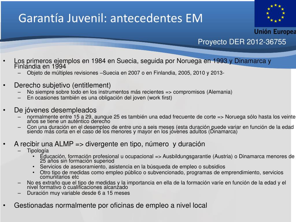 Garantía Juvenil: antecedentes EM • Los primeros ejemplos en 1984 en Suecia, seguida por Noruega en 1993 y Dinamarca y Finlandia en 1994 • Objeto de múltiples revisiones –Suecia en 2007 o en Finlandia, 2005, 2010 y 2013- • Derecho subjetivo (entitlement) • No siempre sobre todo en los instrumentos más recientes => compromisos (Alemania) • En ocasiones también es una obligación del joven (workfirst) • De jóvenes desempleados • normalmente entre 15 a 29, aunque 25 es también una edad frecuente de corte => Noruega sólo hasta los veinte años se tiene un auténtico derecho • Con una duración en el desempleo de entre uno a seis meses (esta duración puede variar en función de la edad siendo más corta en el caso de los menores y mayor en los jóvenes adultos (Dinamarca) • A recibir una ALMP => divergente en tipo, número y duración • Tipología • Educación, formación profesional u ocupacional => Ausbildungsgarantie(Austria) o Dinamarca menores de 25 años sin formación superiod • Servicios de asesoramiento, asistencia en la búsqueda de empleo o subsidios • Otro tipo de medidas como empleo público o subvencionado, programas de emprendimiento, servicios comunitarios etc • No es extraño que el tipo de medidas y la importancia en ella de la formación varíe en función de la edad y el nivel formativo o cualificaciones alcanzado • Duración muy variable desde 6 a 15 meses • Gestionadas normalmente por oficinas de empleo a nivel local
