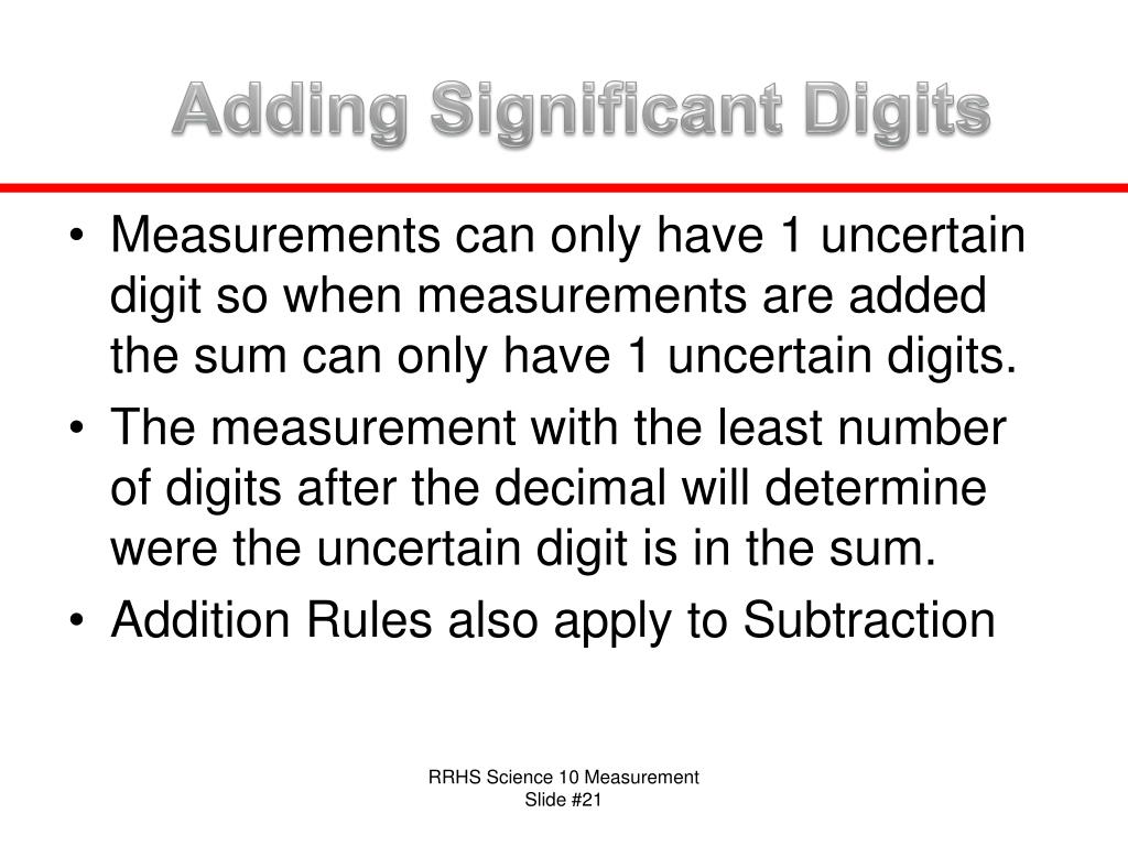 Adding Significant Digits • Measurements can only have 1 uncertain digit so when measurements are added the sum can only have 1 uncertain digits. • The measurement with the least number of digits after the decimal will determine were the uncertain digit is in the sum. • Addition Rules also apply to Subtraction