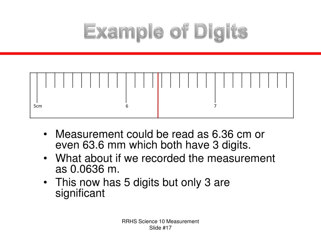 Example of Digits • Measurement could be read as 6.36 cm or even 63.6 mm which both have 3 digits. • What about if we recorded the measurement as 0.0636 m. • This now has 5 digits but only 3 are significant