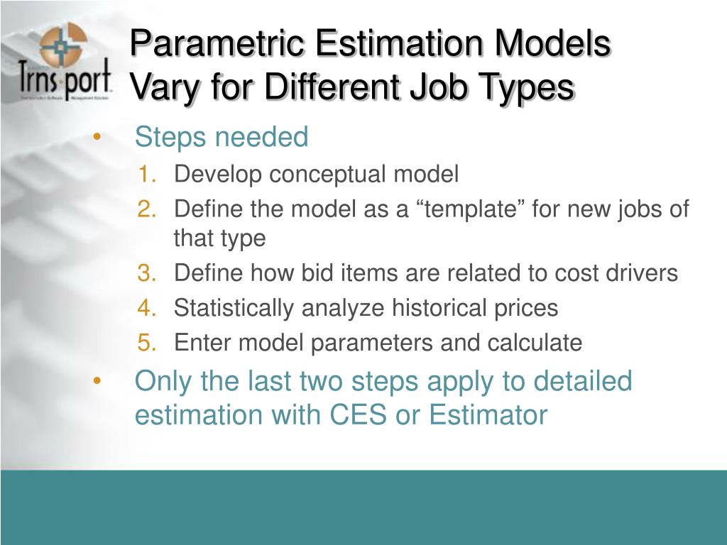 Parametric Estimation Models Vary for Different Job Types • Steps needed • Develop conceptual model • Define the model as a “template” for new jobs of that type • Define how bid items are related to cost drivers • Statistically analyze historical prices • Enter model parameters and calculate • Only the last two steps apply to detailed estimation with CES or Estimator