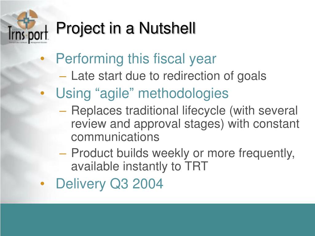 Project in a Nutshell • Performing this fiscal year • Late start due to redirection of goals • Using “agile” methodologies • Replaces traditional lifecycle (with several review and approval stages) with constant communications • Product builds weekly or more frequently, available instantly to TRT • Delivery Q3 2004