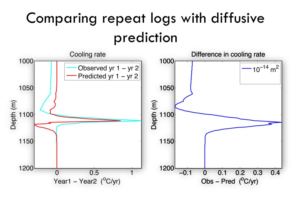 Summary • High permeability (>10-14 m2) needed before significant temperature disturbance • Transiently high permeability after an earthquake? • Country rock permeability important for reducing anomaly • Even withlow frictional heat and groundwater flow, anomaly > 0.1 oC observable within 2 yrs • Repeat logs may help describe advective component and effects of heterogeneity. • Earlier the better for initial log.