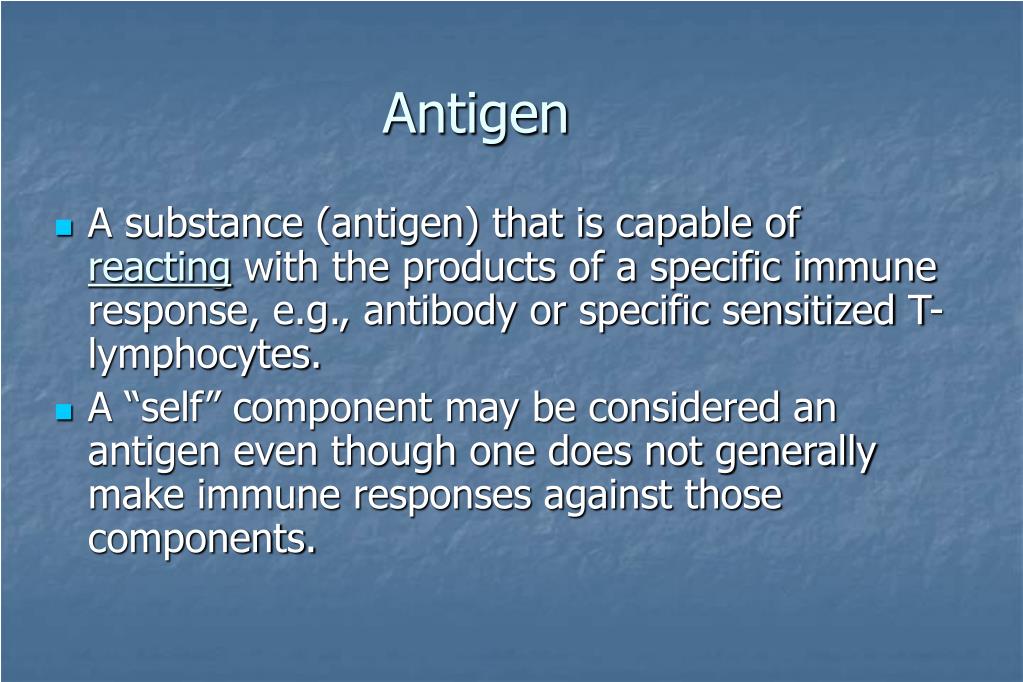 Antigen • A substance (antigen) that is capable of reacting with the products of a specific immune response, e.g., antibody or specific sensitized T-lymphocytes. • A “self” component may be considered an antigen even though one does not generally make immune responses against those components.