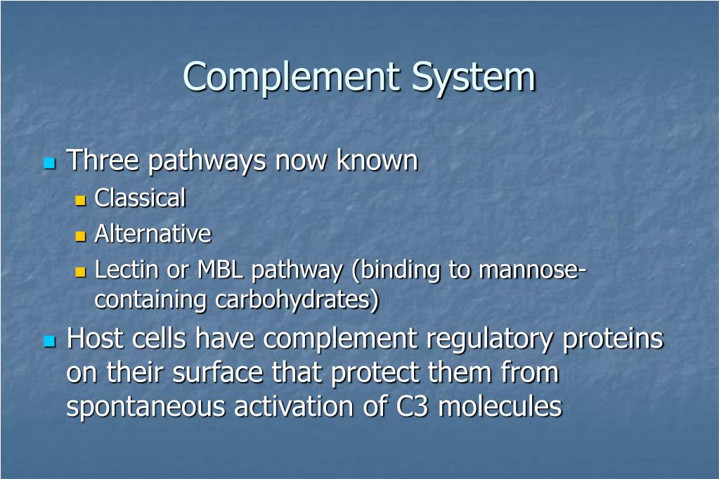 Complement System • Three pathways now known • Classical • Alternative • Lectin or MBL pathway (binding to mannose-containing carbohydrates) • Host cells have complement regulatory proteins on their surface that protect them from spontaneous activation of C3 molecules