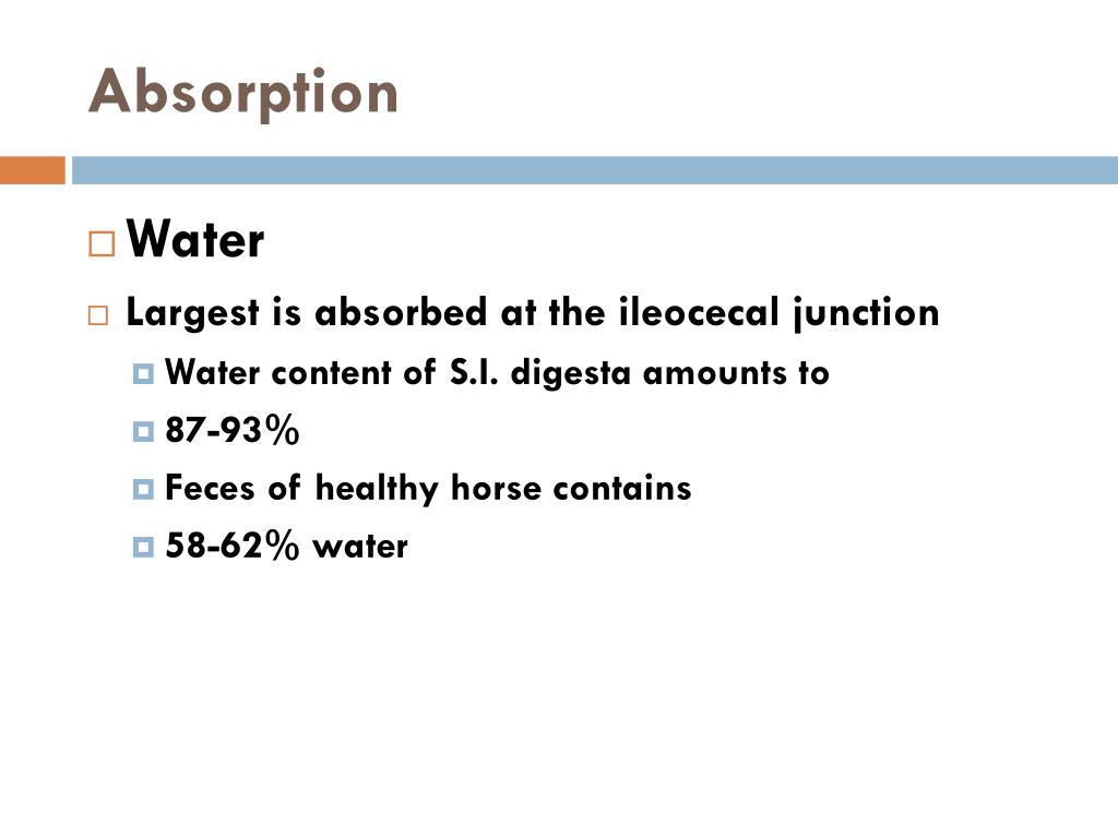 Absorption • Water • Largest is absorbed at the ileocecal junction • Water content of S.I. digesta amounts to • 87-93% • Feces of healthy horse contains • 58-62% water