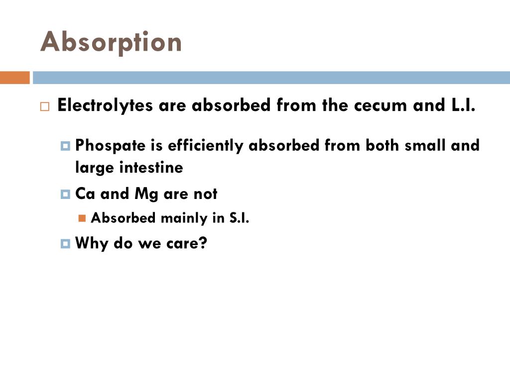 Absorption • Electrolytes are absorbed from the cecum and L.I. • Phospate is efficiently absorbed from both small and large intestine • Ca and Mg are not • Absorbed mainly in S.I. • Why do we care?