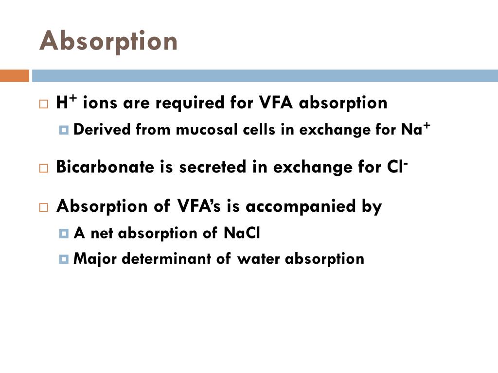 Absorption • H+ ions are required for VFA absorption • Derived from mucosal cells in exchange for Na+ • Bicarbonate is secreted in exchange for Cl- • Absorption of VFA’s is accompanied by • A net absorption of NaCl • Major determinant of water absorption