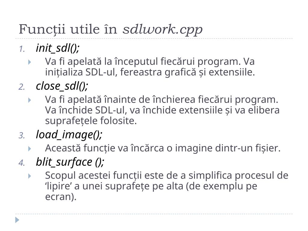 Funcții utile în sdlwork.cpp • init_sdl(); • Va fi apelată la începutul fiecărui program. Va inițializa SDL-ul, fereastra grafică și extensiile. • close_sdl(); • Va fi apelată înainte de închierea fiecărui program. Va închide SDL-ul, va închide extensiile și va elibera suprafețele folosite. • load_image(); • Această funcție va încărca o imagine dintr-un fișier. • blit_surface (); • Scopul acestei funcții este de a simplifica procesul de ‘lipire’ a unei suprafețe pe alta (de exemplu pe ecran).