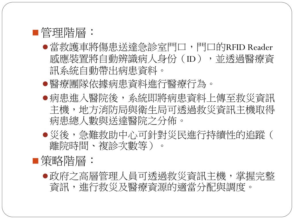 管理階層: • 當救護車將傷患送達急診室門口,門口的RFID Reader感應裝置將自動辨識病人身份(ID),並透過醫療資訊系統自動帶出病患資料。 • 醫療團隊依據病患資料進行醫療行為。 • 病患進入醫院後,系統即將病患資料上傳至救災資訊主機,地方消防局與衛生局可透過救災資訊主機取得病患總人數與送達醫院之分佈。 • 災後,急難救助中心可針對災民進行持續性的追蹤(離院時間、複診次數等)。 • 策略階層: • 政府之高層管理人員可透過救災資訊主機,掌握完整資訊,進行救災及醫療資源的適當分配與調度。