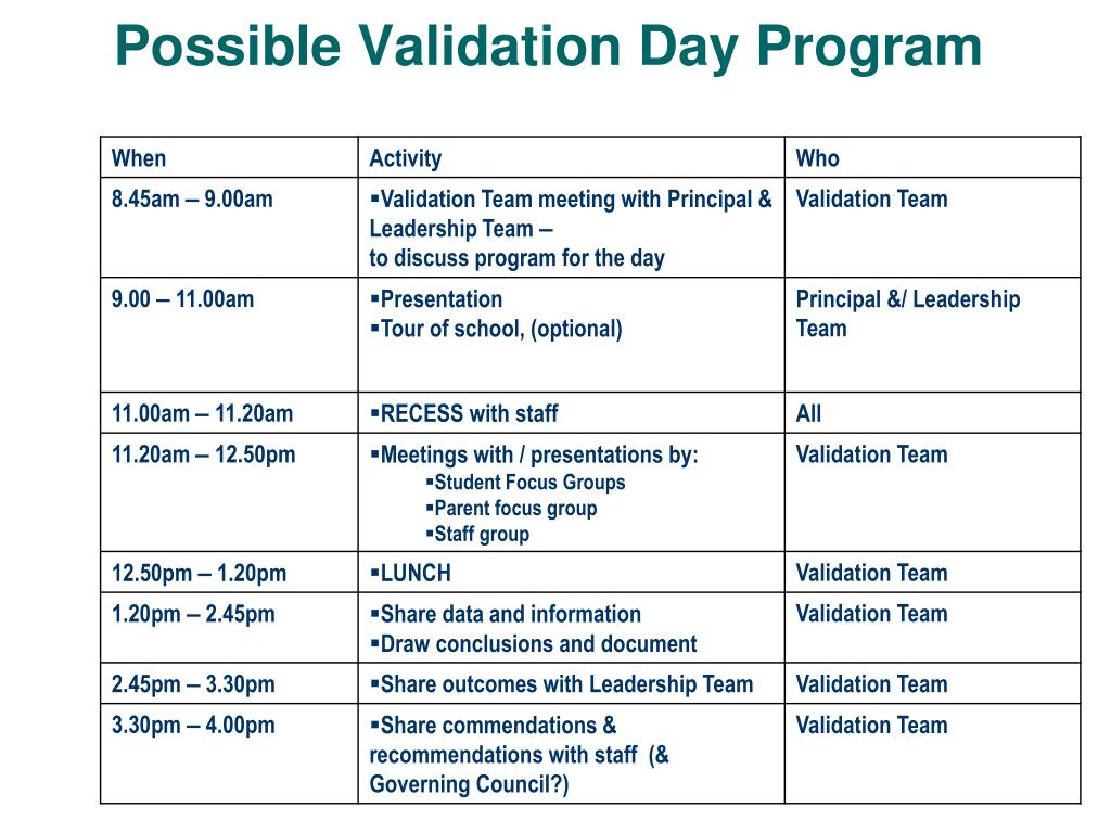 Purpose of Validation in Schools Validation provides the formal opportunity for: School leaders and their communities to…. • Reflect on practices and present their school’s improvement journey from the past three years, and • Gain feedback, confirmation and recommendations on future directions