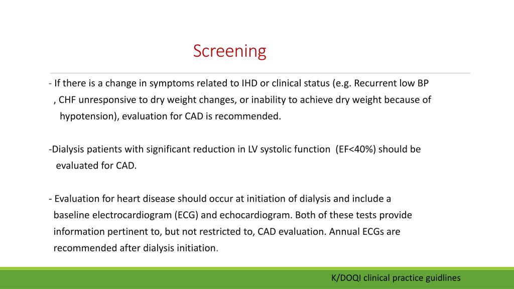 Screening - If there is a change in symptoms related to IHD or clinical status (e.g. Recurrent low BP , CHF unresponsive to dry weight changes, or inability to achieve dry weight because of • hypotension), evaluation for CAD is recommended. • -Dialysis patients with significant reduction in LV systolic function (EF<40%) should be • evaluated for CAD. • - Evaluation for heart disease should occur at initiation of dialysis and include a • baseline electrocardiogram (ECG) and echocardiogram. Both of these tests provide • information pertinent to, but not restricted to, CAD evaluation. Annual ECGs are • recommended after dialysis initiation. K/DOQI clinical practice guidlines