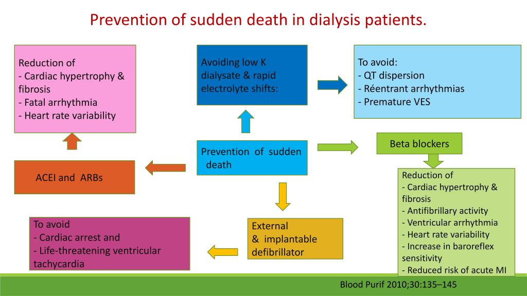 Prevention of sudden death in dialysis patients. Reduction of ‐ Cardiac hypertrophy & fibrosis ‐ Fatal arrhythmia ‐ Heart rate variability Avoiding low K dialysate & rapid electrolyte shifts: To avoid: ‐ QT dispersion ‐ Réentrant arrhythmias ‐ Premature VES Beta blockers Prevention of sudden death ACEI and ARBs Reduction of ‐ Cardiac hypertrophy & fibrosis ‐ Antifibrillary activity ‐ Ventricular arrhythmia ‐ Heart rate variability ‐ Increase in baroreflex sensitivity ‐ Reduced risk of acute MI To avoid ‐ Cardiac arrest and ‐ Life‐threatening ventricular tachycardia External & implantable defibrillator Blood Purif 2010;30:135–145