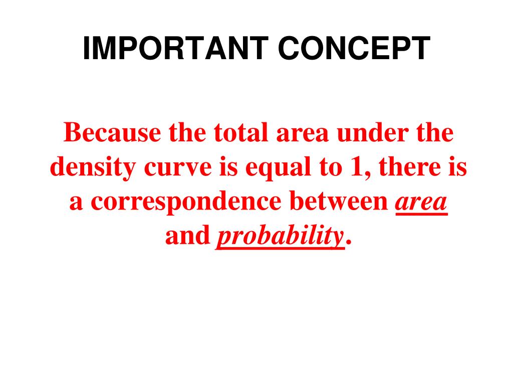 IMPORTANT CONCEPT Because the total area under the density curve is equal to 1, there is a correspondence between area and probability.