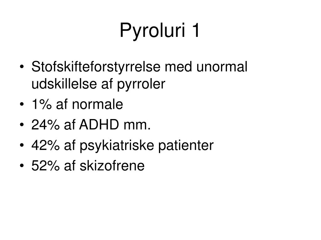 Pyroluri 1 • Stofskifteforstyrrelse med unormal udskillelse af pyrroler • 1% af normale • 24% af ADHD mm. • 42% af psykiatriske patienter • 52% af skizofrene