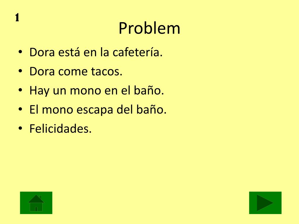 Problem 1 • Dora está en la cafetería. • Dora come tacos. • Hay un mono en el baño. • El mono escapa del baño. • Felicidades.