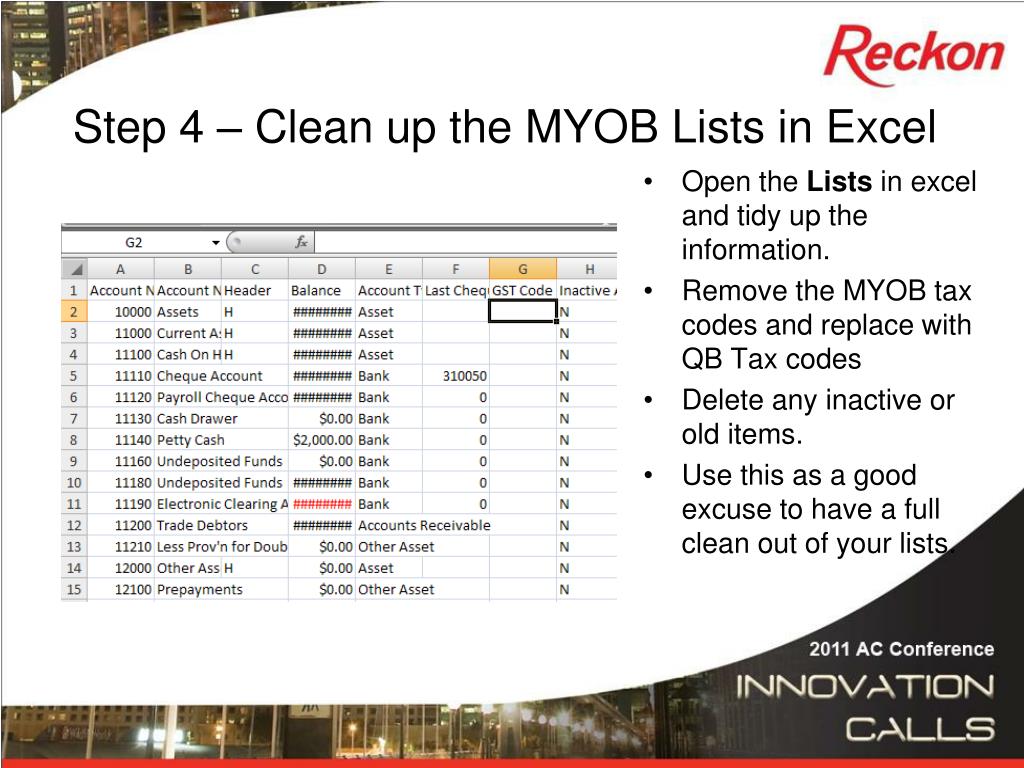 Step 4 – Clean up the MYOB Lists in Excel • Open the Lists in excel and tidy up the information. • Remove the MYOB tax codes and replace with QB Tax codes • Delete any inactive or old items. • Use this as a good excuse to have a full clean out of your lists.