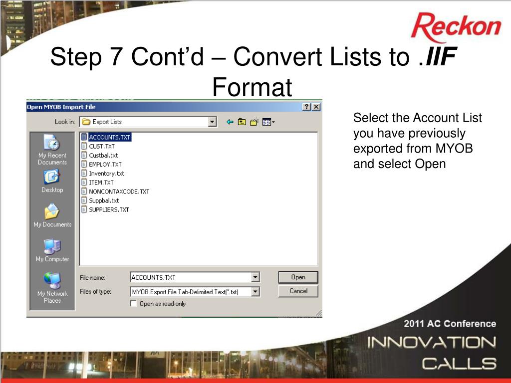 Step 7 Cont’d – Convert Lists to .IIF Format Select the Account List you have previously exported from MYOB and select Open