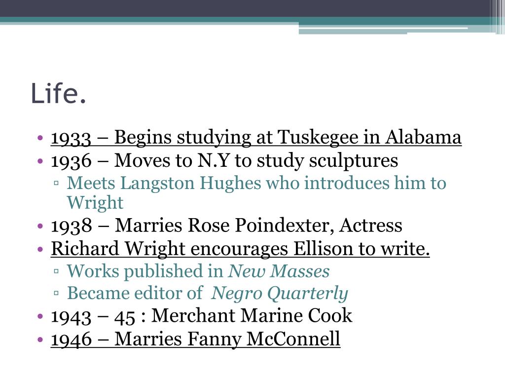 Life. • 1933 – Begins studying at Tuskegee in Alabama • 1936 – Moves to N.Y to study sculptures • Meets Langston Hughes who introduces him to Wright • 1938 – Marries Rose Poindexter, Actress • Richard Wright encourages Ellison to write. • Works published in New Masses • Became editor of Negro Quarterly • 1943 – 45 : Merchant Marine Cook • 1946 – Marries Fanny McConnell
