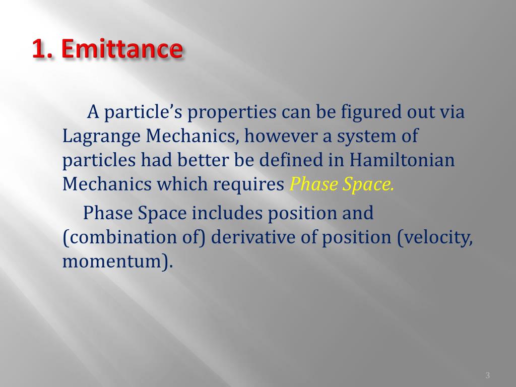 1. Emittance A particle’s properties can be figured out via Lagrange Mechanics, however a system of particles had better be defined in Hamiltonian Mechanicswhich requires Phase Space. Phase Space includes position and (combination of) derivative of position (velocity, momentum).