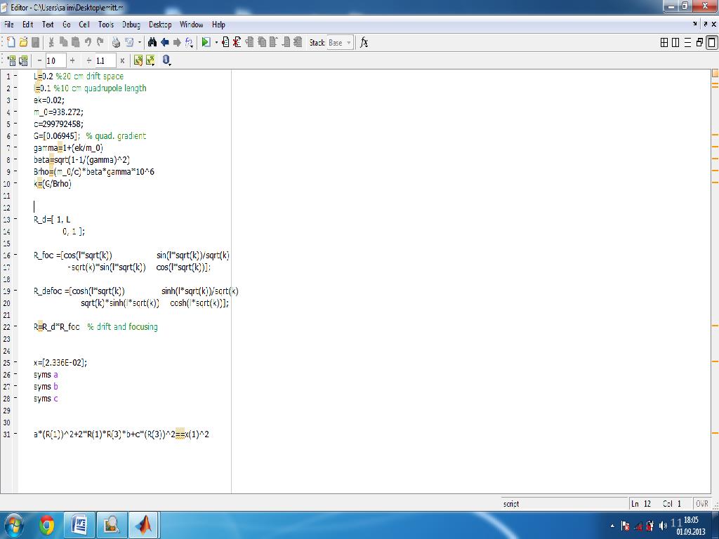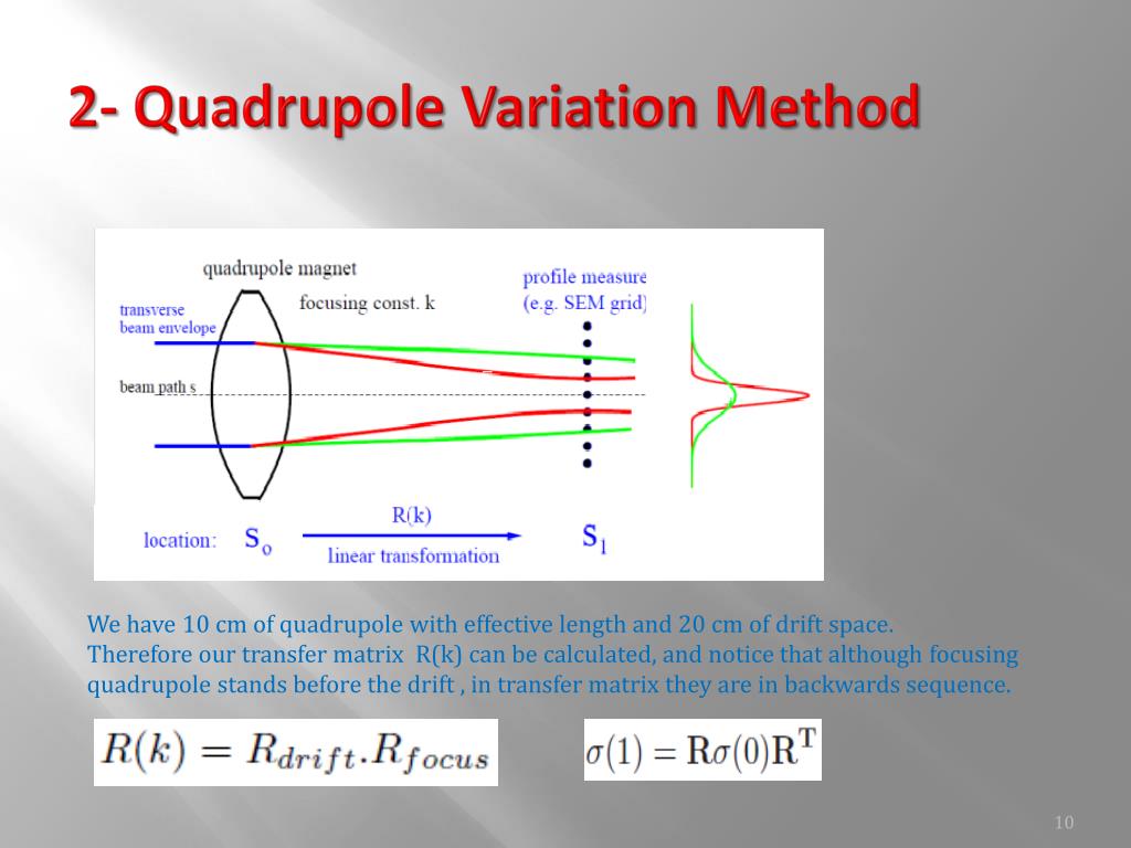 2- Quadrupole Variation Method We have 10 cm of quadrupole with effective length and 20 cm of drift space. Therefore our transfer matrix R(k)can be calculated, and notice that although focusingquadrupole stands before the drift , in transfer matrix they are in backwards sequence.