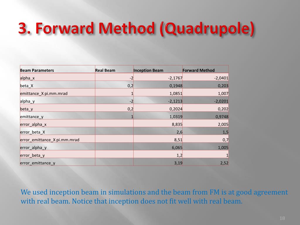 3. ForwardMethod (Quadrupole) We used inception beam in simulations and the beam from FM is at good agreement with real beam. Notice that inception does not fit well with real beam.
