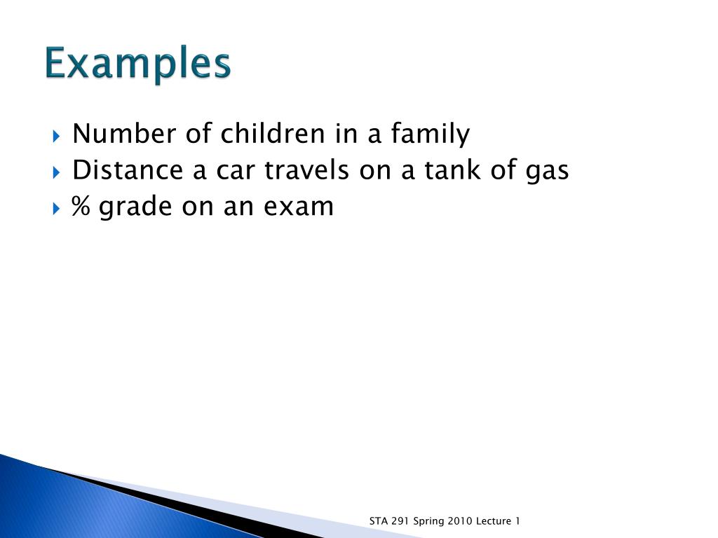 Examples • Number of children in a family • Distance a car travels on a tank of gas • % grade on an exam STA 291 Spring 2010 Lecture 1