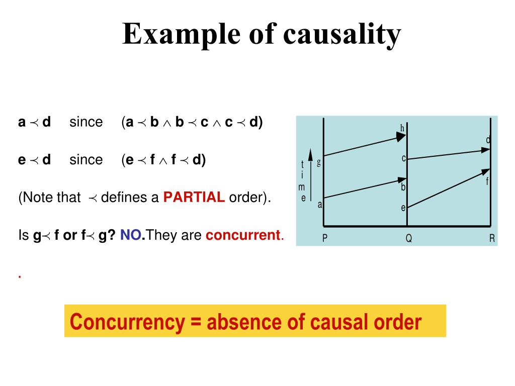 a d since (a bb cc d) e d since (e ff d) (Note that defines a PARTIAL order). Is g f or f g? NO.They are concurrent. . Example of causality Concurrency = absence of causal order