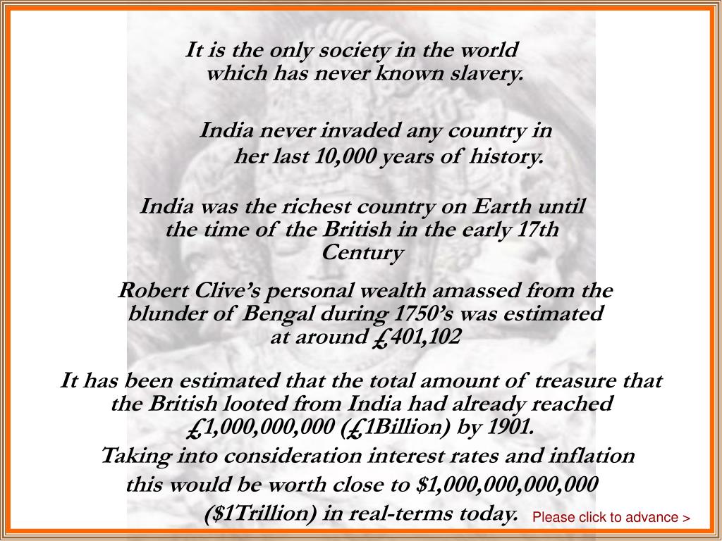 India never invaded any country in her last 10,000 years of history. India It is the only society in the world which has never known slavery. India was the richest country on Earth until the time of the British in the early 17th Century Robert Clive’s personal wealth amassed from the blunder of Bengal during 1750’s was estimated at around £401,102 It has been estimated that the total amount of treasure that the British looted from India had already reached £1,000,000,000 (£1Billion) by 1901. Taking into consideration interest rates and inflation this would be worth close to $1,000,000,000,000 ($1Trillion) in real-terms today. Please click to advance >