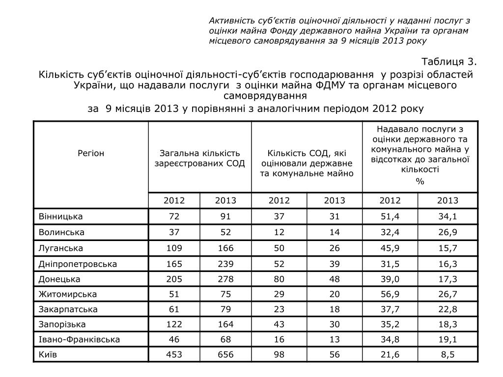 Активність суб’єктів оціночної діяльності у наданні послуг з оцінки майна Фонду державного майна України та органам місцевого самоврядуванняза 9 місяців 2013 року Таблиця 3. Кількість суб’єктів оціночної діяльності-суб’єктів господарювання у розрізі областей України, що надавали послуги з оцінки майна ФДМУ та органам місцевого самоврядування за 9 місяців 2013 у порівнянні з аналогічним періодом 2012 року