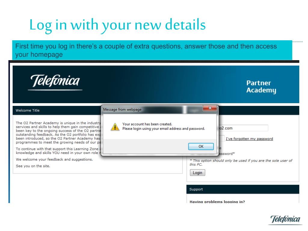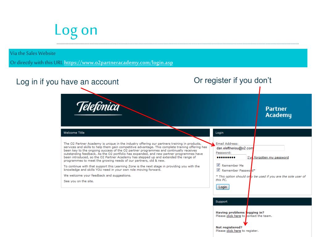 Log on Via the Sales Website Or directly with this URL https://www.o2partneracademy.com/login.asp Or register if you don’t Log in if you have an account 02 05