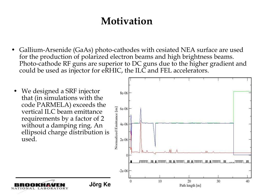 Gallium-Arsenide (GaAs) photo-cathodes with cesiated NEA surface are used for the production of polarized electron beams and high brightness beams. Photo-cathode RF guns are superior to DC guns due to the higher gradient and could be used as injector for eRHIC, the ILC and FEL accelerators. Motivation • We designed a SRF injector that (in simulations with the code PARMELA) exceeds the vertical ILC beam emittance requirements by a factor of 2 without a damping ring. An ellipsoid charge distribution is used. Jörg Kewisch, October 2, 2007, PESP2008