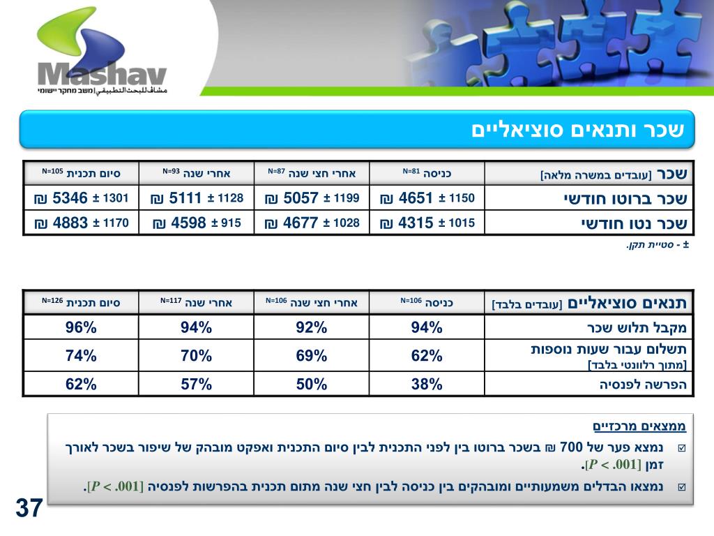 שכר ותנאים סוציאליים ע"פ מסלול ± - סטיית תקן ממצאים מרכזיים • פערים משמעותיים ומובהקים בשכר חצי שנה מתום התכנית וכן בשינוי בשכר כניסה לעומת חצי שנה מתום תכנית.