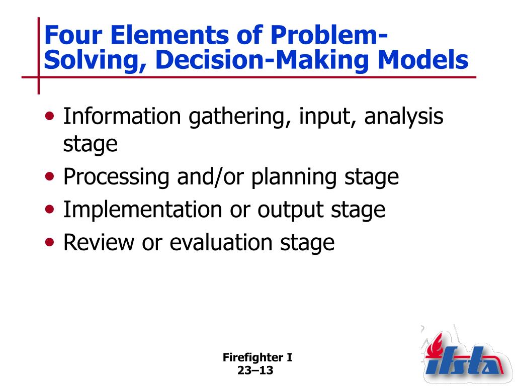 Four Elements of Problem-Solving, Decision-Making Models • Information gathering, input, analysis stage • Processing and/or planning stage • Implementation or output stage • Review or evaluation stage Firefighter I