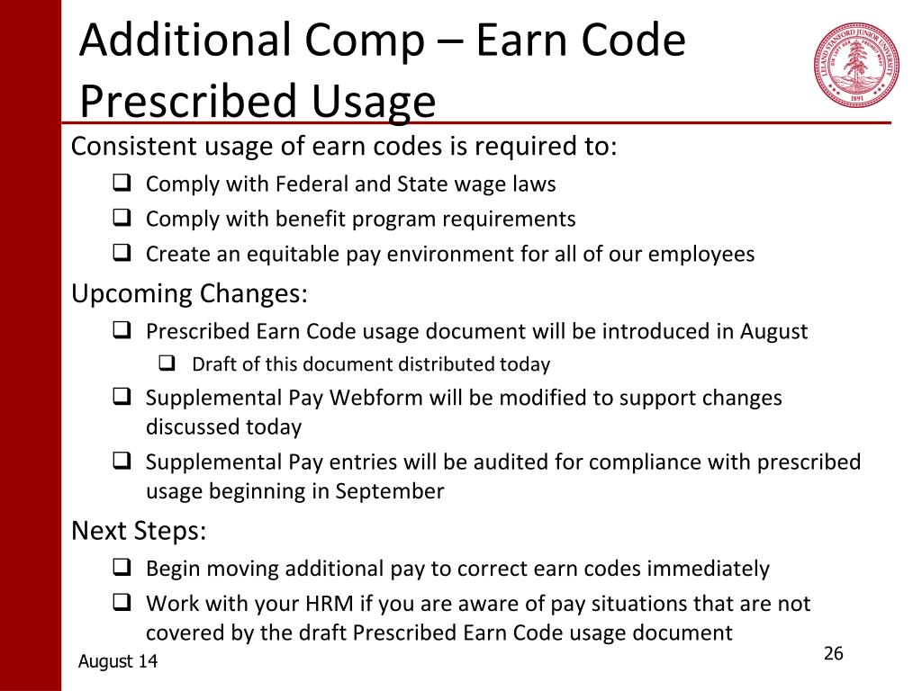 Additional Comp – Earn Code Prescribed Usage Consistent usage of earn codes is required to: • Comply with Federal and State wage laws • Comply with benefit program requirements • Create an equitable pay environment for all of our employees Upcoming Changes: • Prescribed Earn Code usage document will be introduced in August • Draft of this document distributed today • Supplemental Pay Webform will be modified to support changes discussed today • Supplemental Pay entries will be audited for compliance with prescribed usage beginning in September Next Steps: • Begin moving additional pay to correct earn codes immediately • Work with your HRM if you are aware of pay situations that are not covered by the draft Prescribed Earn Code usage document