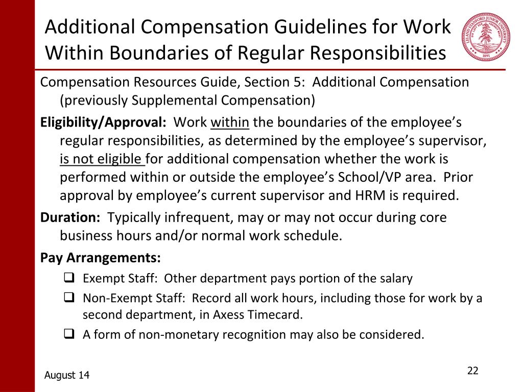 Additional Compensation Guidelines for Work Outside Boundaries of Regular Responsibilities Compensation Resources Guide, Section 5: Additional Compensation (previously Supplemental Compensation) Eligibility/Approval: Work outside the boundaries of the employee’s regular responsibilities, as determined by the employee’s supervisor, which the university would need to otherwise hire other resources, is eligible for additional pay if ALL of the following criteria are met: • Occurs on a one-time or infrequent basis, and • Requires a significant amount of time in excess of the normal work schedule, and • Employee receives prior written approval from supervisor in advance of the work being performed, and • Employee has completed the trial period and/or the employee’s performance in the current job is satisfactory.