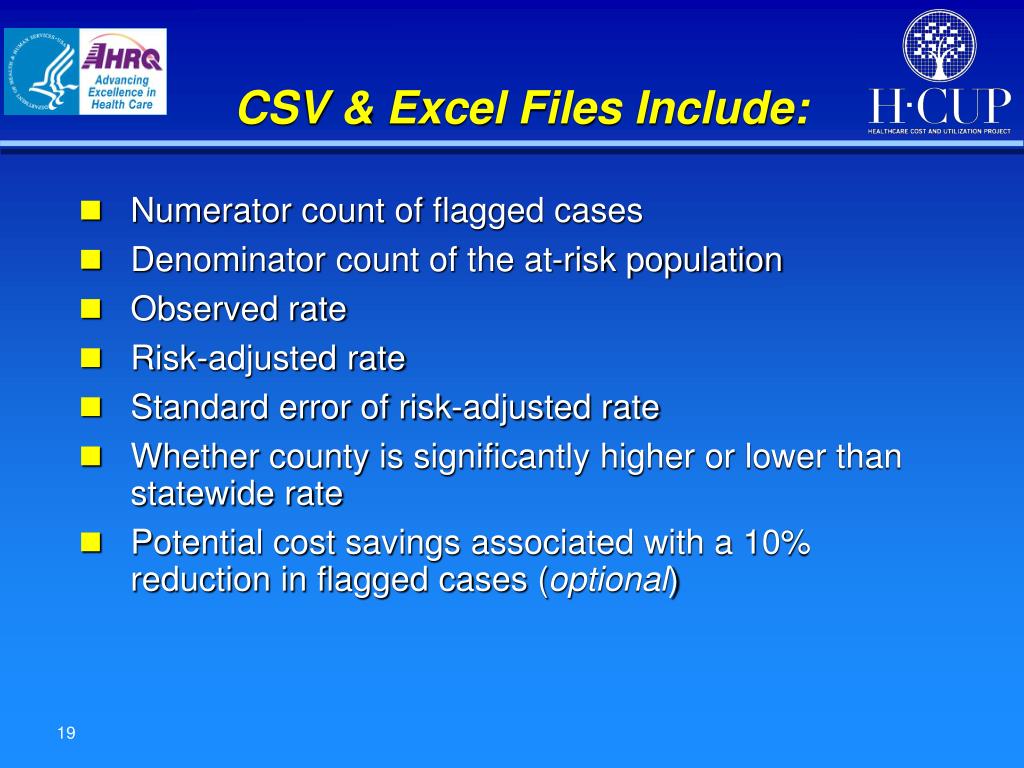 CSV & Excel Files Include: • Numerator count of flagged cases • Denominator count of the at-risk population • Observed rate • Risk-adjusted rate • Standard error of risk-adjusted rate • Whether county is significantly higher or lower than statewide rate • Potential cost savings associated with a 10% reduction in flagged cases (optional)