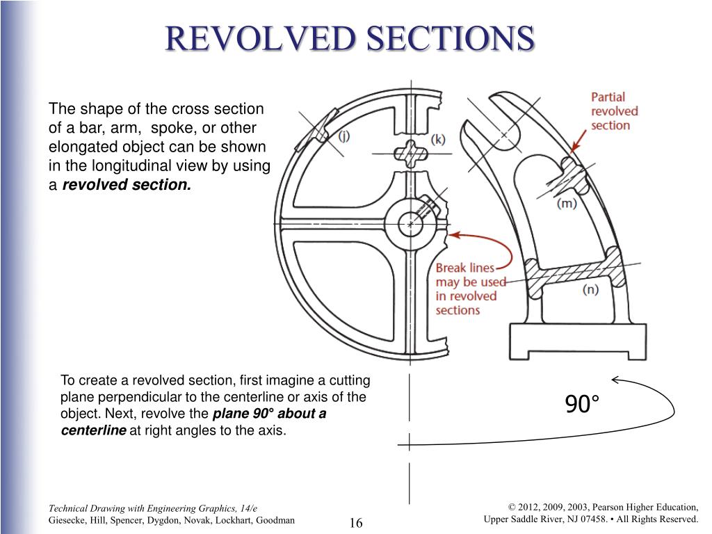 REVOLVED SECTIONS The shape of the cross section of a bar, arm, spoke, or other elongated object can be shown in the longitudinal view by using a revolved section. To create a revolved section, first imagine a cutting plane perpendicular to the centerline or axis of the object. Next, revolve the plane 90° about a centerlineat right angles to the axis. 90°