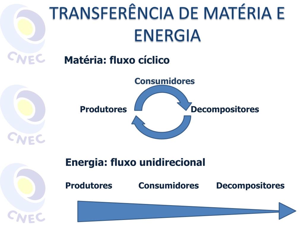 TRANSFERÊNCIA DE MATÉRIA E ENERGIA Matéria: fluxo cíclico Produtores Decompositores Consumidores Energia: fluxo unidirecional Produtores Consumidores Decompositores