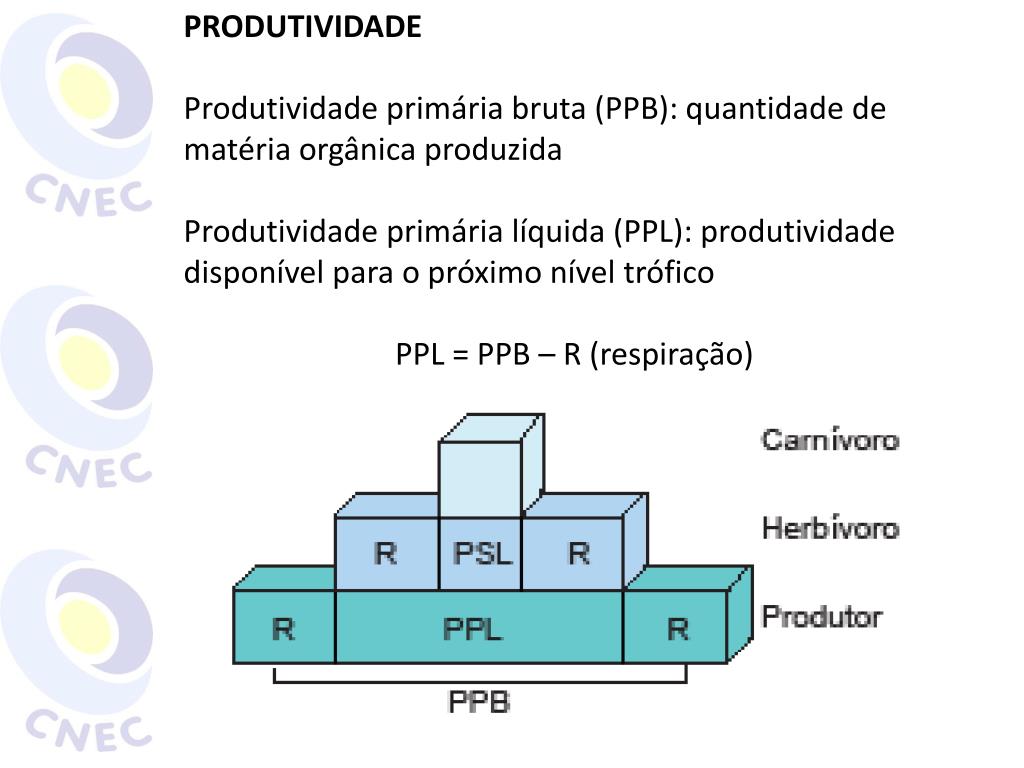 PRODUTIVIDADE Produtividade primária bruta (PPB): quantidade de matéria orgânica produzida Produtividade primária líquida (PPL): produtividade disponível para o próximo nível trófico PPL = PPB – R (respiração)