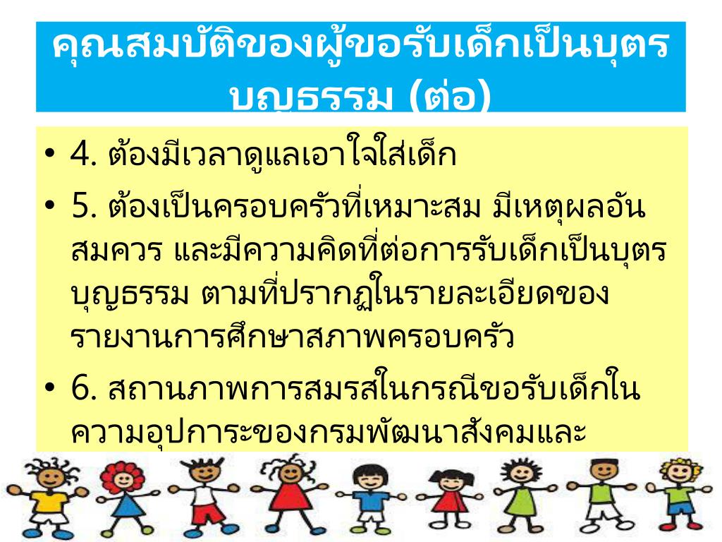 คุณสมบัติของผู้ขอรับเด็กเป็นบุตรบุญธรรม(ต่อ)คุณสมบัติของผู้ขอรับเด็กเป็นบุตรบุญธรรม(ต่อ) • 4. ต้องมีเวลาดูแลเอาใจใส่เด็ก • 5. ต้องเป็นครอบครัวที่เหมาะสม มีเหตุผลอันสมควร และมีความคิดที่ต่อการรับเด็กเป็นบุตรบุญธรรม ตามที่ปรากฏในรายละเอียดของรายงานการศึกษาสภาพครอบครัว • 6. สถานภาพการสมรสในกรณีขอรับเด็กในความอุปการะของกรมพัฒนาสังคมและสวัสดิการ ผู้ขอฯ ควรจะมีคู่สมรส เพื่อเด็กจะได้มีครอบครัวที่สมบูรณ์